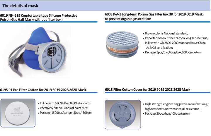 ●With a P-A-1(3#) Filter,to prevent organic gas or steam,for example, Aniline, gasoline, acetone, carbon disulfide, alcohols, ethers, aldehydes, carbon tetrachloride, three potassium chloride, methyl chloride, nitrobenzene, chloropicrin;